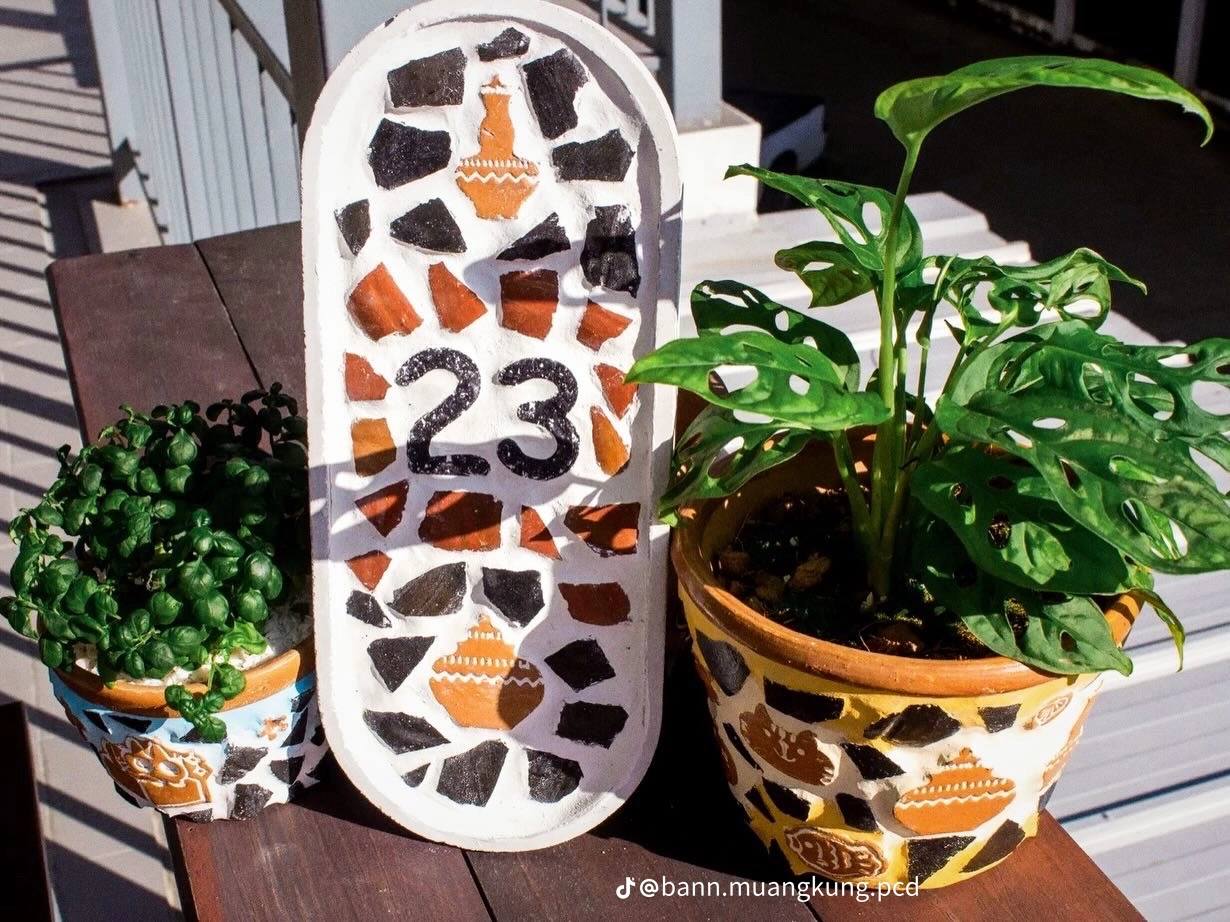 สร้างสรรค์กระถาง / จานรองแก้ว / ป้ายบ้านเลขที่ ด้วยโมเสกดินเผาที่ได้จากเศษผลิตภัณฑ์แตกหักเสียหาย ในกระบวนการผลิตของหมู่บ้านเหมืองกุง