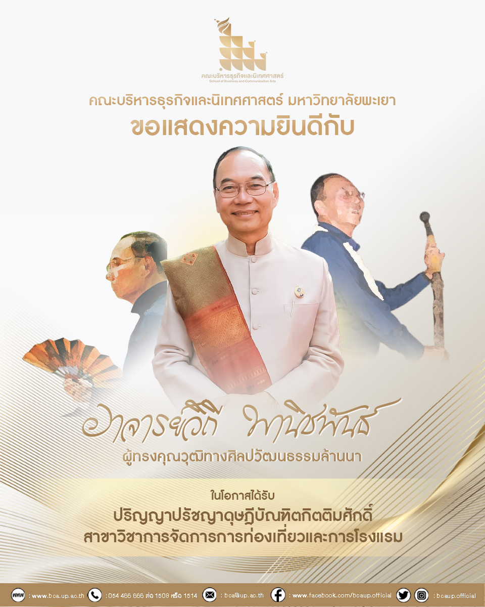 ขอแสดงความยินดีกับ อาจารย์วิถี พานิชพันธ์ ในโอกาสได้รับ ปริญญาปรัชญาดุษฎีบัณฑิตกิตติมศักดิ์ สาขาวิชาการจัดการการท่องเที่ยวและการโรงแรม จาก มหาวิทยาลัยพะเยา