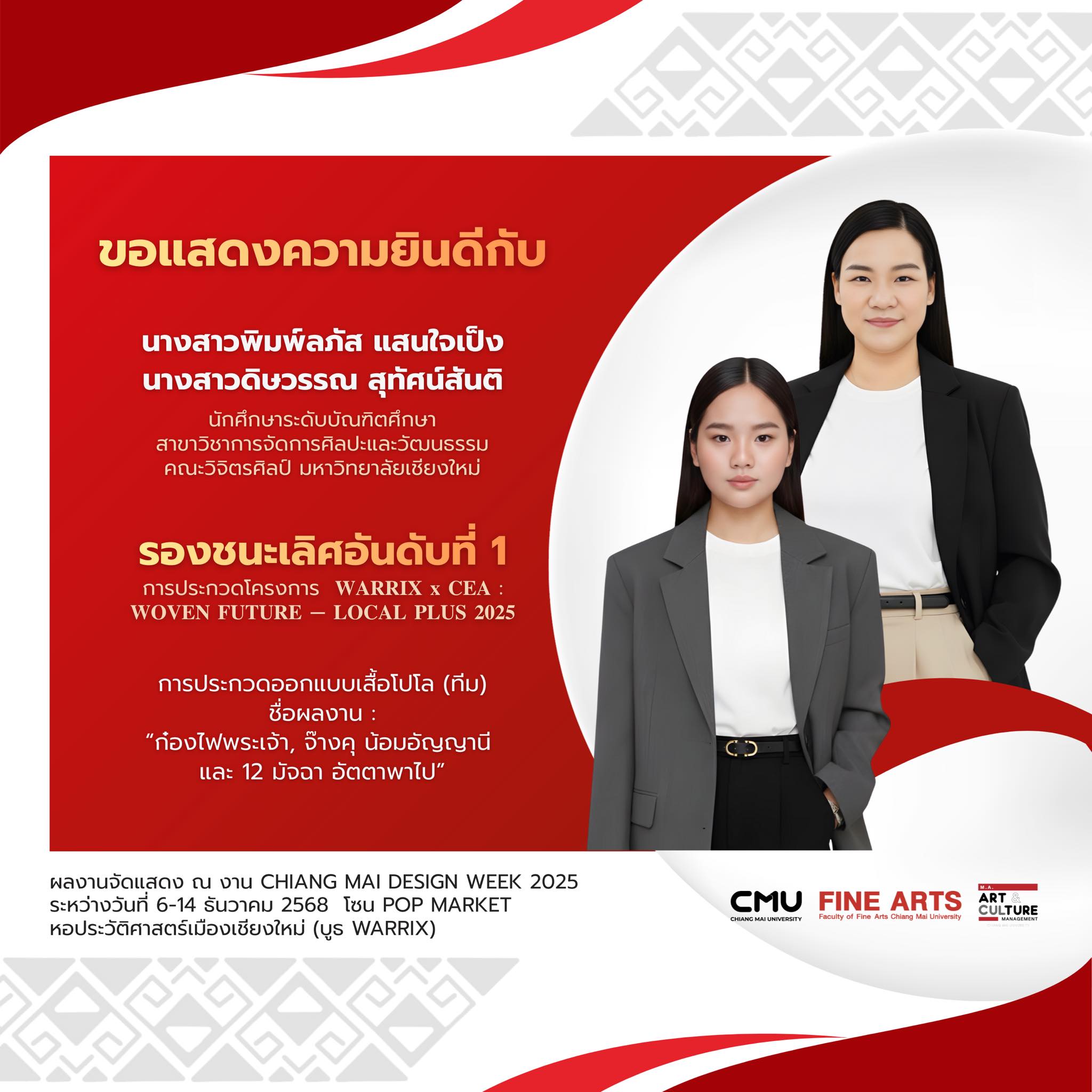 คณะวิจิตรศิลป์ ขอแสดงความยินดีกับนักศึกษา ระดับบัณฑิตศึกษา สาขาวิชาการจัดการศิลปะและวัฒนธรรม ได้รับ รางวัลรองชนะเลิศอันดับที่ 1 จากการประกวดโครงการ WARRIX x CEA : WOVEN FUTURE — LOCAL PLUS 2025