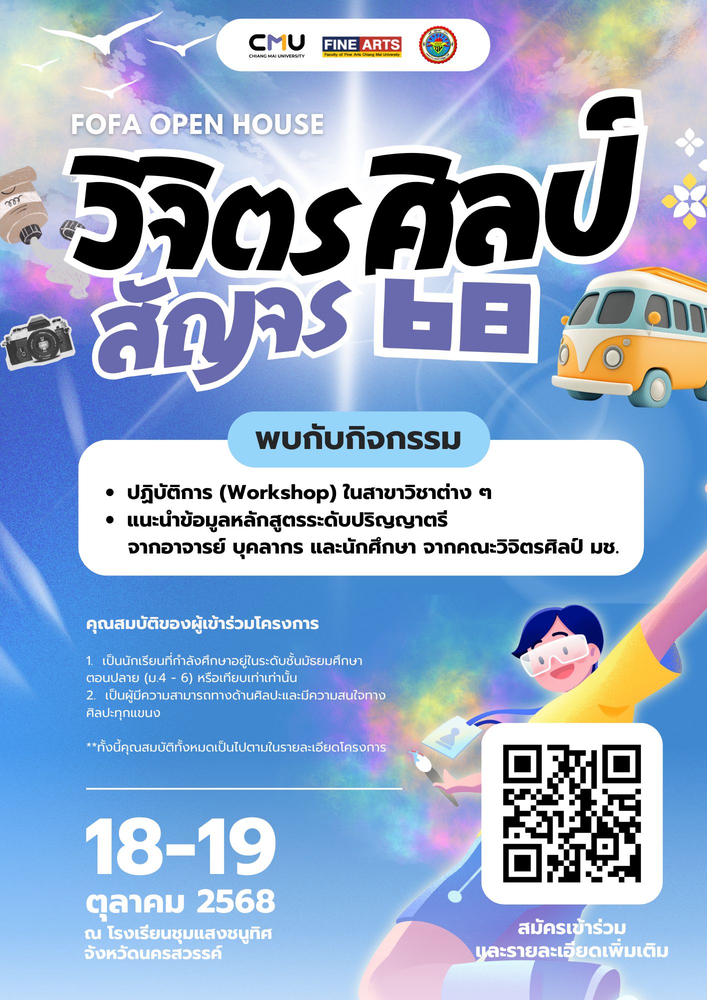 คณะวิจิตรศิลป์ มหาวิทยาลัยเชียงใหม่ ร่วมกับ สำนักงานศึกษาธิการภาค 18 และ โรงเรียนชุมแสงชนูทิศ จังหวัดนครสวรรค์ ขอเชิญนักเรียน นักศึกษา และผู้สนใจ เข้าร่วมกิจกรรม “วิจิตรศิลป์สัญจร 68”
