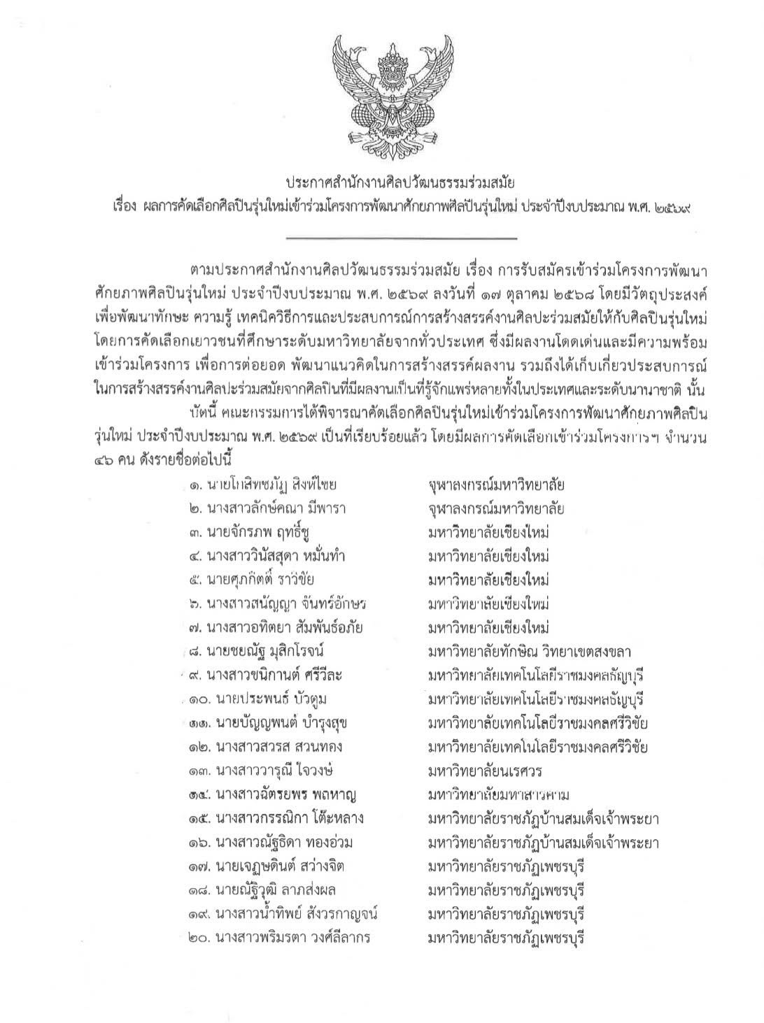 สำนักศิลปวัฒนธรรมร่วมสมัย ได้ประกาศผลการคัดเลือกศิลปินรุ่นใหม่เข้าร่วม โครงการพัฒนาศักยภาพศิลปินรุ่นใหม่ ประจำปีงบประมาณ พ.ศ. 2569 ซึ่งมีวัตถุประสงค์เพื่อพัฒนาทักษะ ความรู้ แนวคิด และประสบการณ์ด้านการสร้างสรรค์ศิลปะร่วมสมัย โดยเปิดรับผลงานจากนักศึกษาระดับอุดมศึกษาทั่วประเทศ และคัดเลือกผู้มีผลงานโดดเด่นเข้าร่วมโครงการอย่างเป็นทางการ