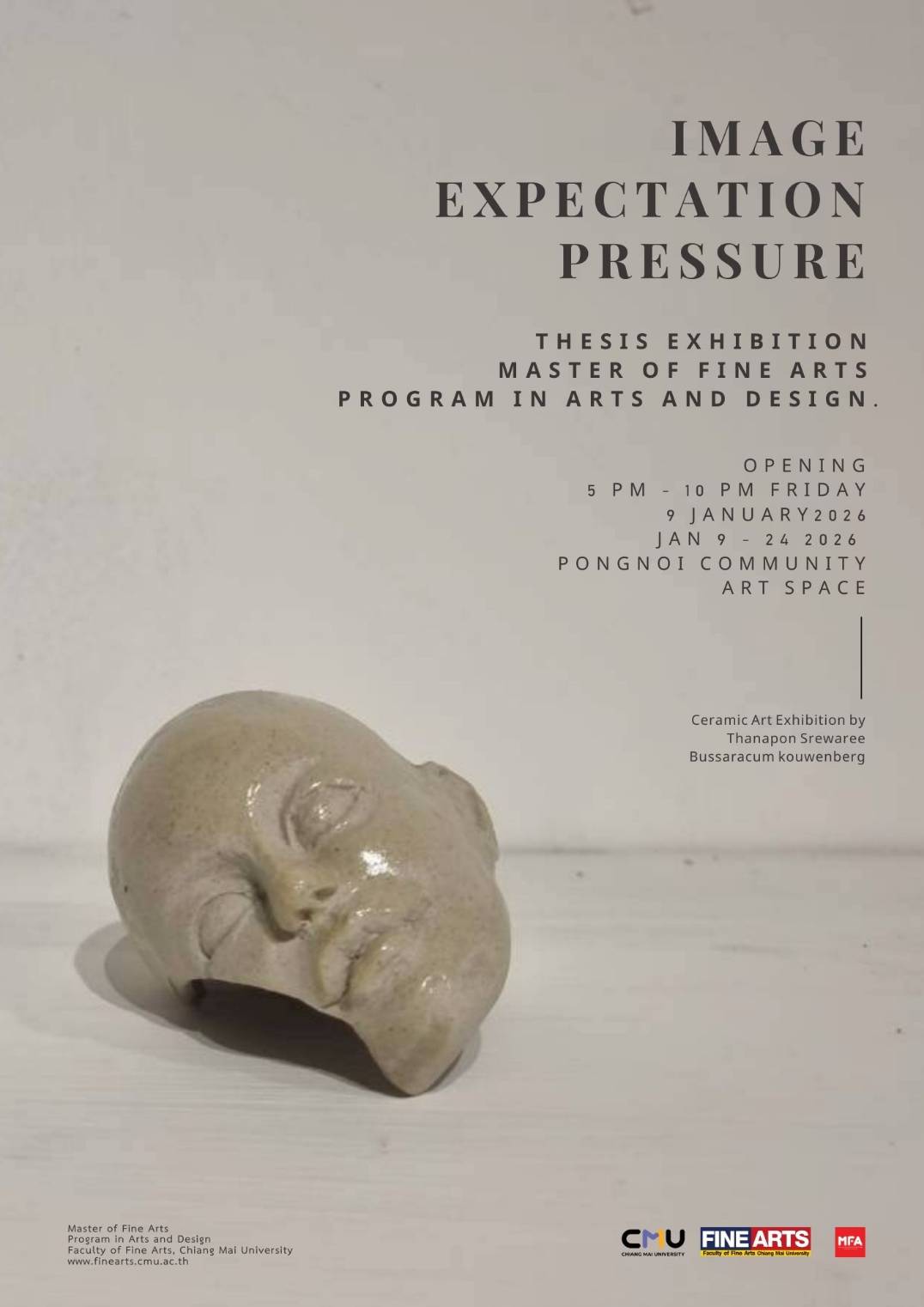 นิทรรศการนำเสนอการตั้งคำถามและสะท้อนแรงกดดันจาก “ภาพคาดหวัง” ที่สังคมมีต่อรูปลักษณ์ อัตลักษณ์ และตัวตนของมนุษย์ ผ่านกระบวนการสร้างสรรค์งานศิลปะเซรามิก ซึ่งผสานความงามทางรูปทรง วัสดุ และแนวคิดเชิงวิพากษ์เข้าด้วยกัน