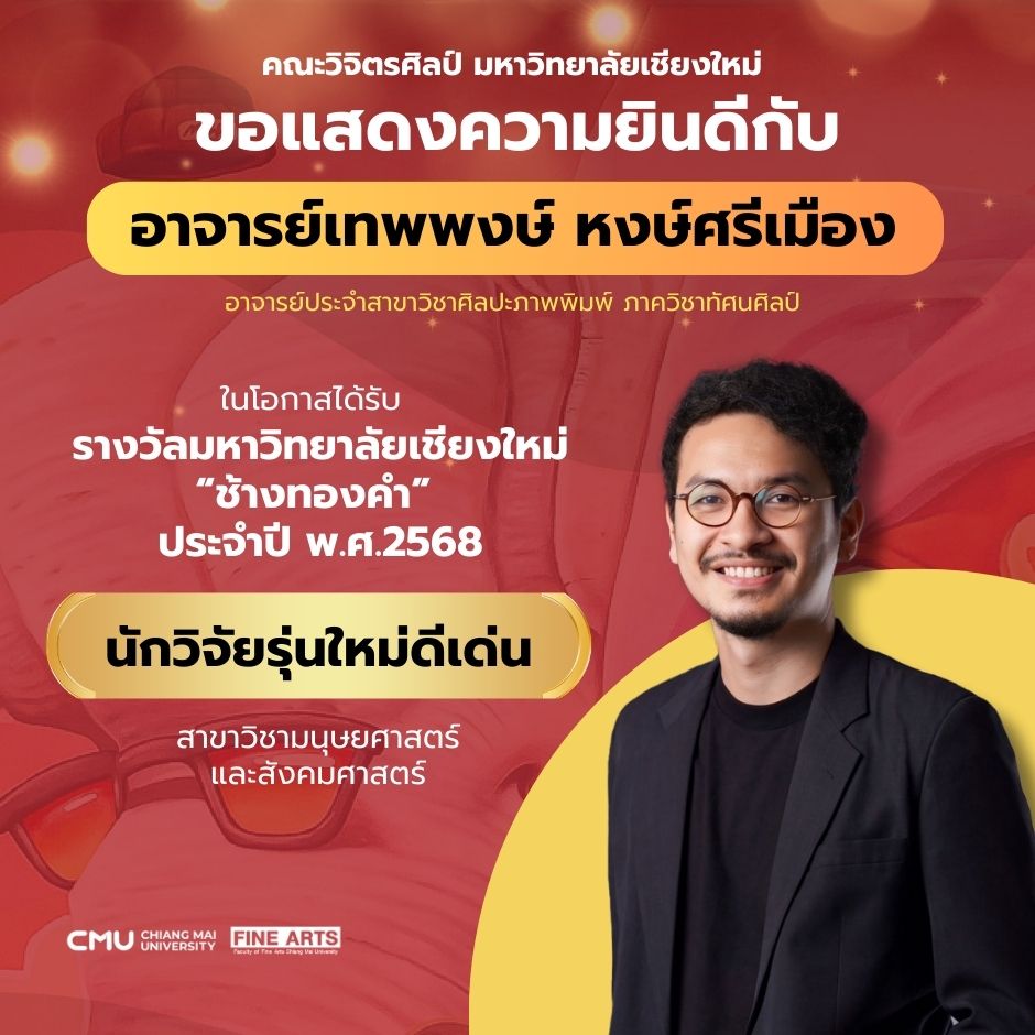 คณะวิจิตรศิลป์ มหาวิทยาลัยเชียงใหม่ ขอแสดงความยินดีอย่างยิ่งกับ อาจารย์เทพพงษ์ หงษ์ศรีเมือง ในโอกาสได้รับรางวัลมหาวิทยาลัยเชียงใหม่ “ช้างทองคำ” ประจำปี พ.ศ. 2568 นักวิจัยรุ่นใหม่ดีเด่น ในสาขาวิชามนุษยศาสตร์และสังคมศาสตร์