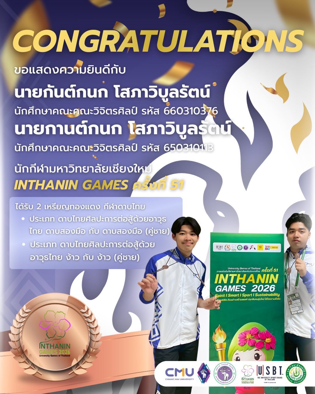 นักศึกษาสาขาวิชาศิลปะไทยและวัฒนธรรมสร้างสรรค์ ในโอกาสเป็นนักกีฬามหาวิทยาลัยเชียงใหม่ และได้รับ 2 เหรียญทองแดง จากการแข่งขันกีฬาดาบไทย ในการแข่งขันกีฬา มหาวิทยาลัยแห่งประเทศไทย ครั้งที่ 51 (INTHANIN GAMES ครั้งที่ 51) ขอขอบคุณข่าวจาก : เพจ CMU Sports