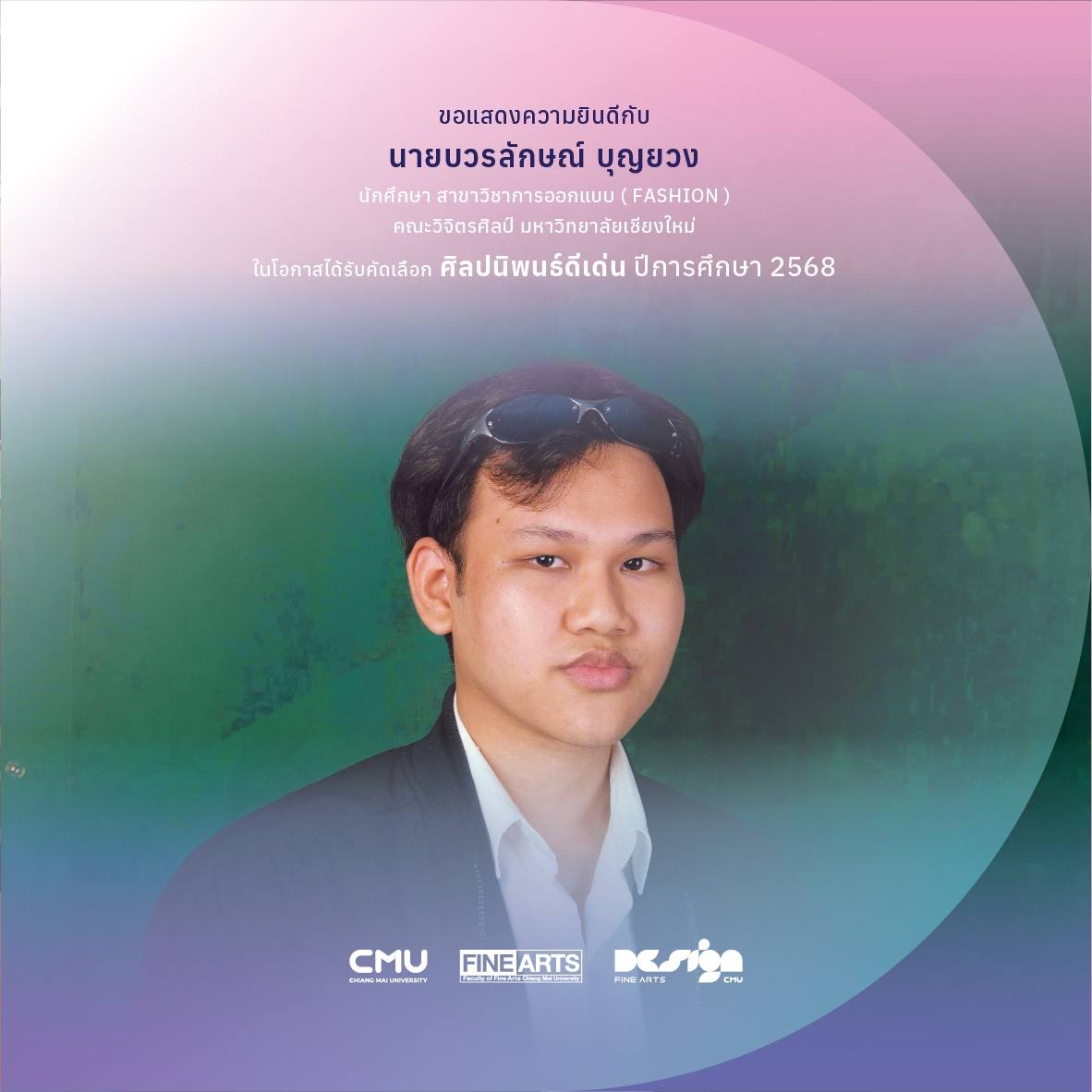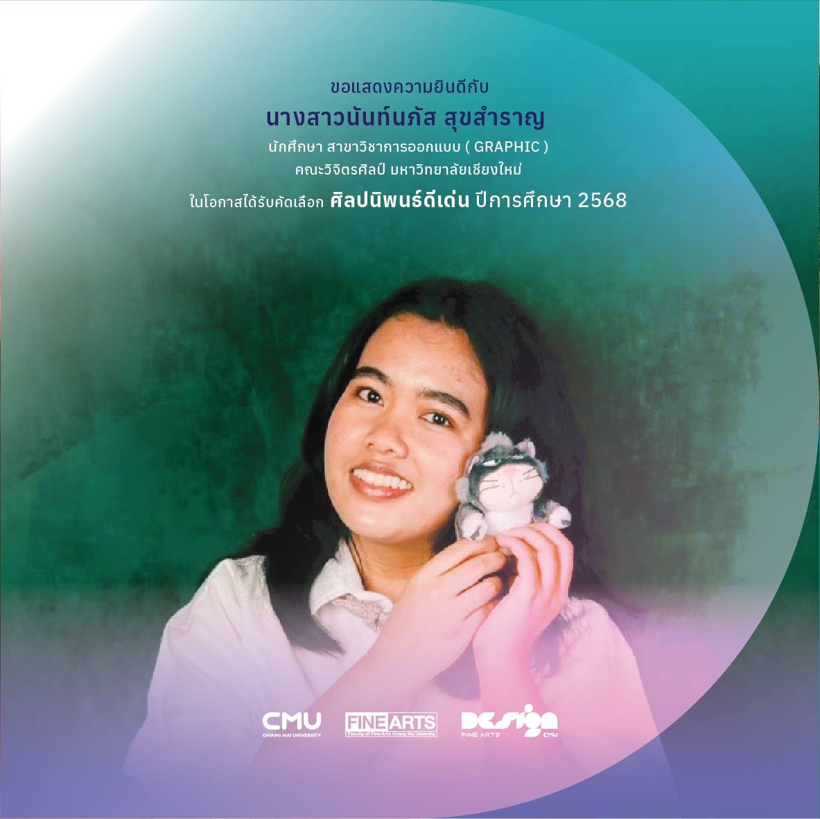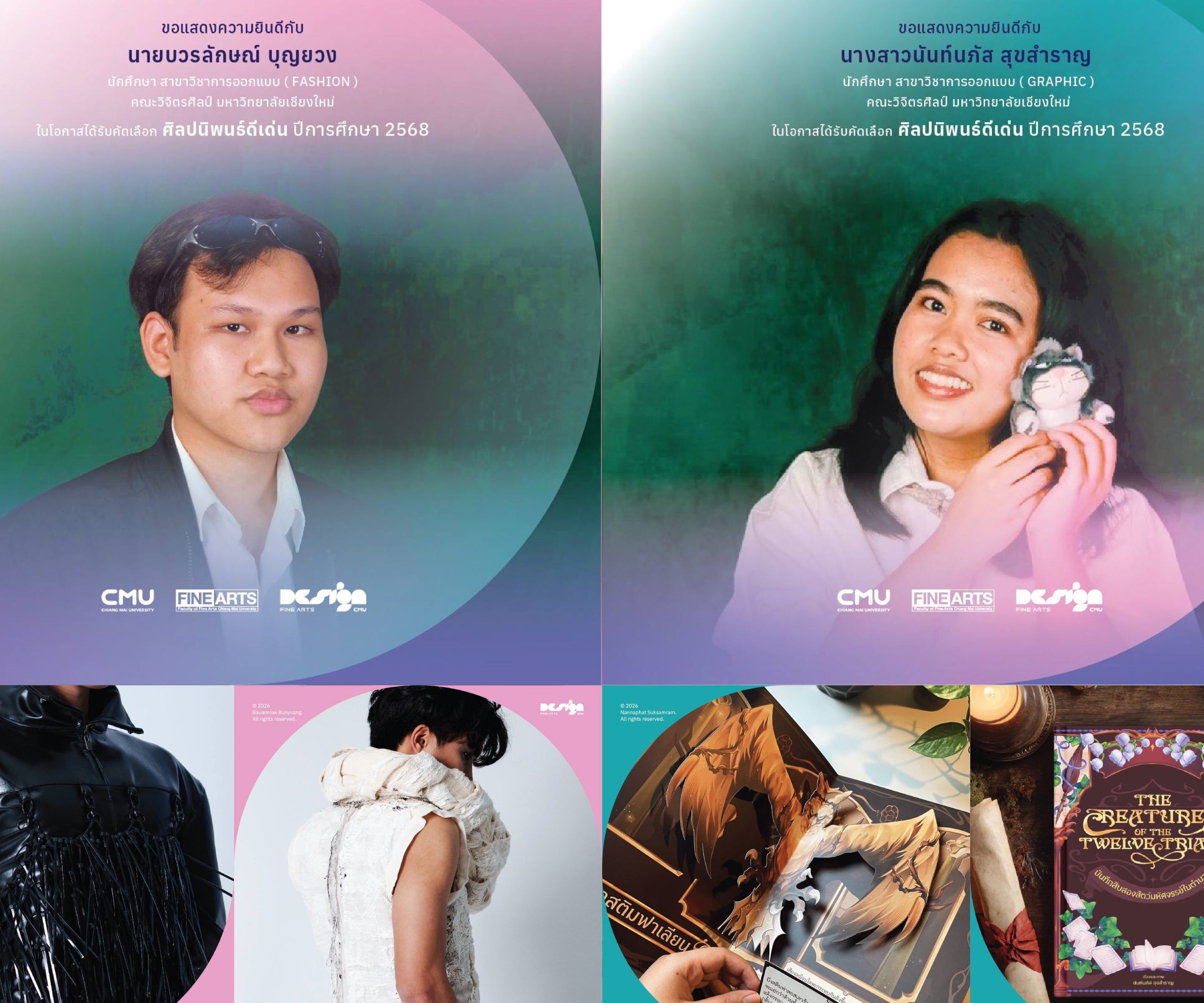 คณะวิจิตรศิลป์ มหาวิทยาลัยเชียงใหม่ ขอแสดงความยินดีกับนักศึกษาชั้นปีที่ 4 สาขาวิชาการออกแบบ แฟชั่นและกราฟิก ในโอกาสที่ได้รับการคัดเลือก 'ศิลปนิพนธ์ดีเด่น ประจำปีการศึกษา 2568