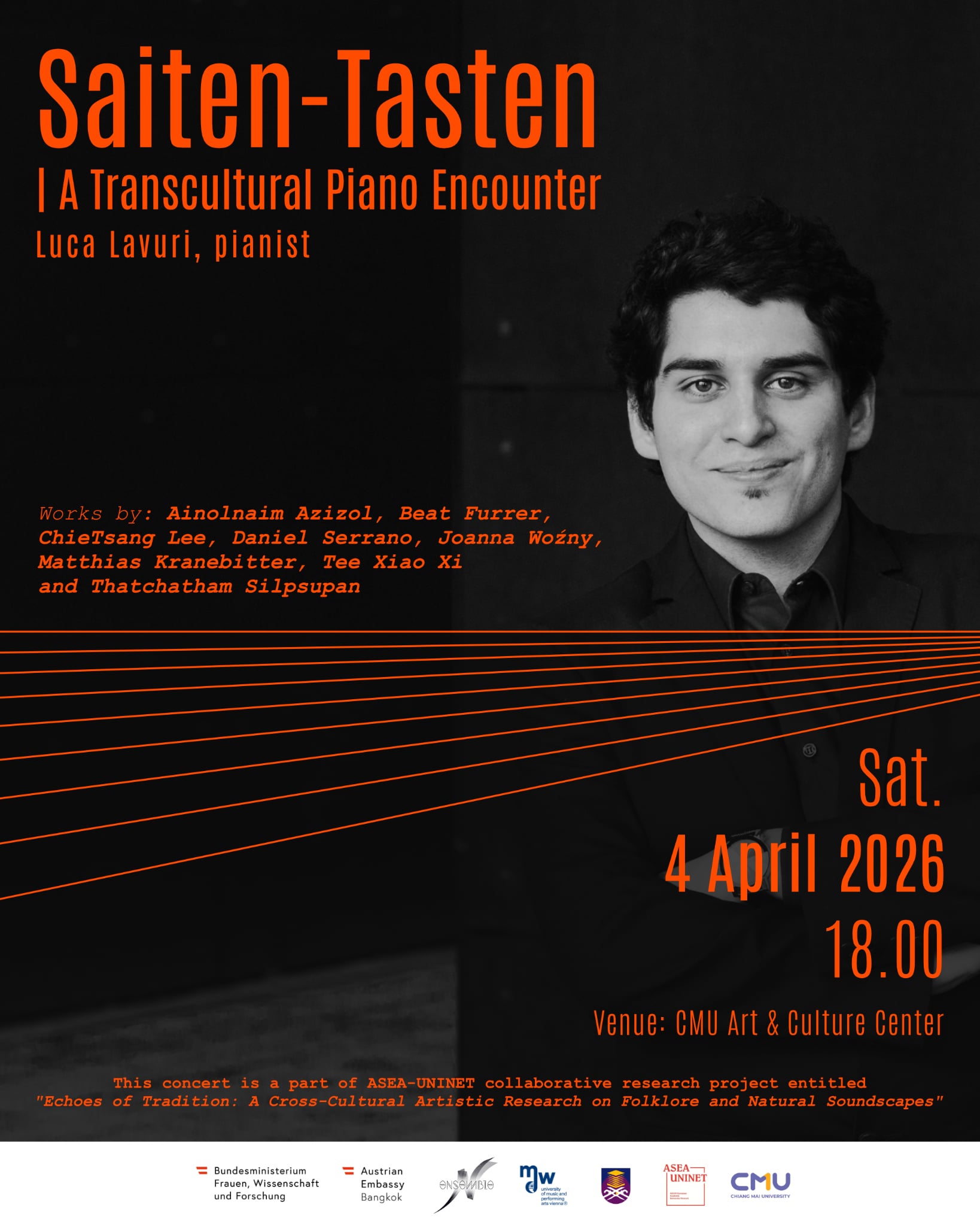 คณะวิจิตรศิลป์ มหาวิทยาลัยเชียงใหม่ ขอเชิญชวนทุกท่านเข้าร่วมรับฟังคอนเสิร์ต Saiten-Tasten | A Transcultural Piano Encounter