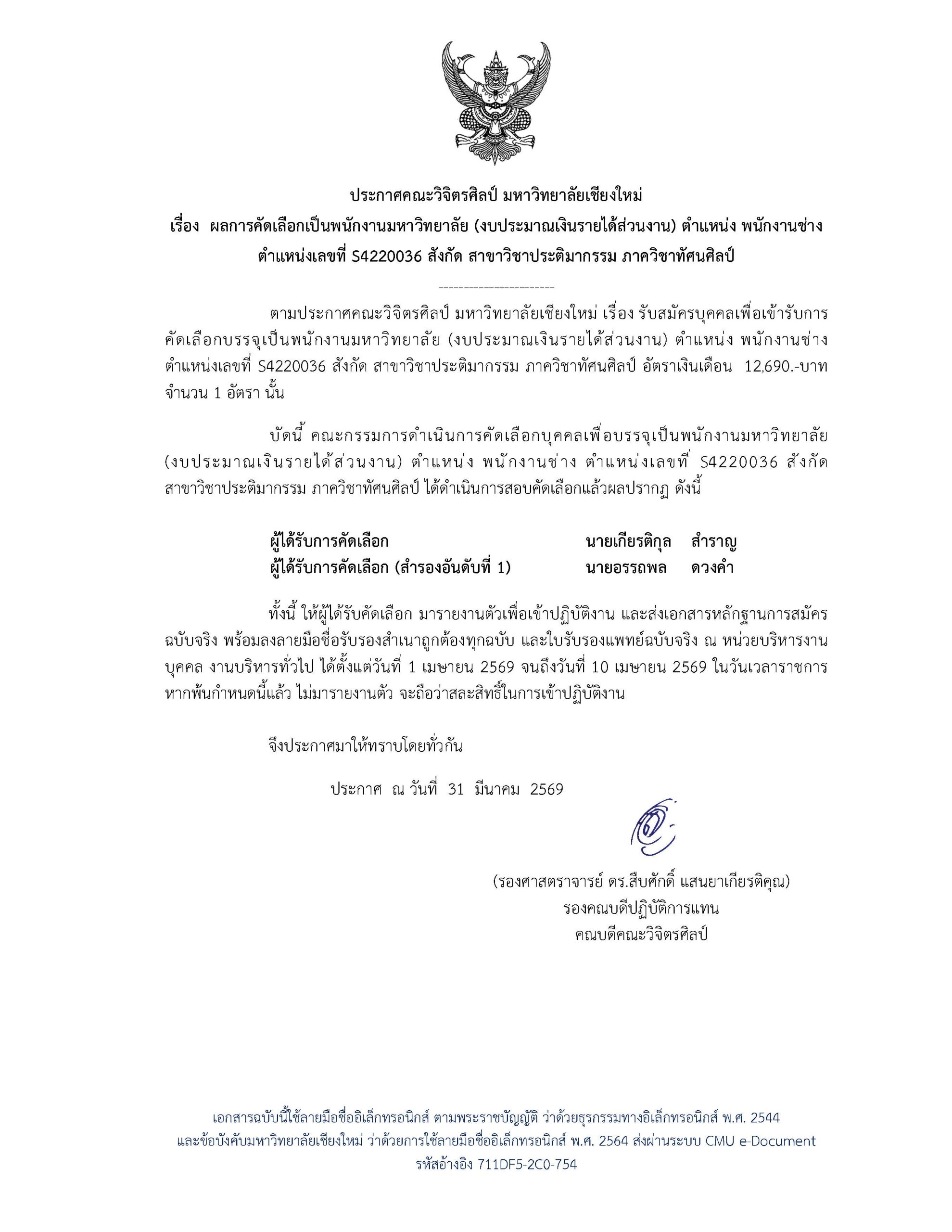 ประกาศผลการคัดเลือกเป็นพนักงานมหาวิทยาลัย (งบประมาณเงินรายได้ส่วนงาน) ตำแหน่ง พนักงานช่าง ตำแหน่งเลขที่ S4220036 สังกัด สาขาวิชาประติมากรรม ภาควิชาทัศนศิลป์