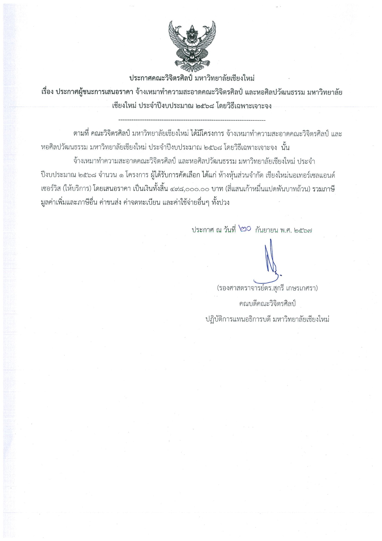 ประกาศผู้ชนะการเสนอราคา จ้างเหมาทำความสะอาดคณะวิจิตรศิลป์ และหอศิลปวัฒนธรรม มหาวิทยาลัยเชียงใหม่ ประจำปีงบประมาณ 2568 โดยวิธีเฉพาะเจาะจง