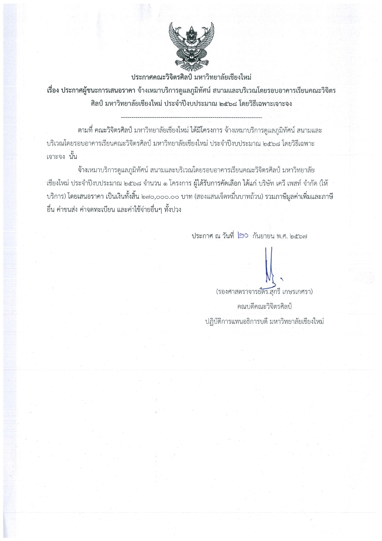 ประกาศผู้ชนะการเสนอราคา จ้างเหมาบริการดูแลภูมิทัศน์สนามและบริเวณโดยรอบอาคารเรียนคณะวิจิตรศิลป์ มหาวิทยาลัยเชียงใหม่ ประจำปีงบประมาณ 2568 โดยวิธีเฉพาะเจาะจง
