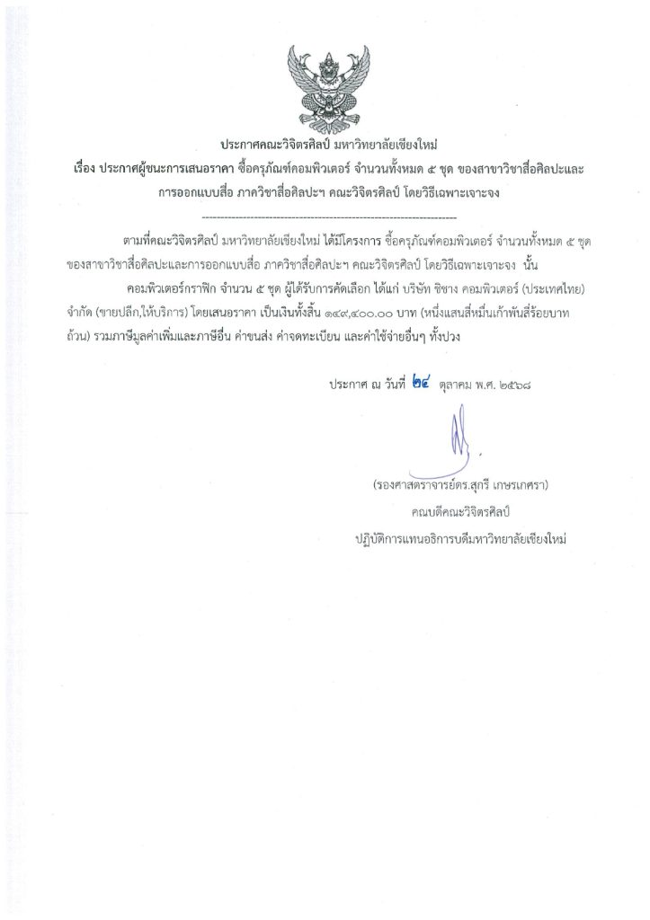 ประกาศผู้ชนะการเสนอราคา ซื้อครุภัณฑ์คอมพิวเตอร์ จำนวนทั้งหมด 5 ชุด ของสาขาวิชาสื่อศิลปะและการออกแบบสื่อ ภาควิชาสื่อศิลปะฯ คณะวิจิตรศิลป์ โดยวิธีเฉพาะเจาะจง