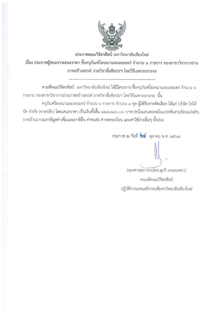 ประกาศผู้ชนะการเสนอราคา ซื้อครุภัณฑ์โฆษณาและเผยแพร่ จำนวน 6 รายการ ของสาขาวิชาการถ่ายภาพสร้างสรรค์ ภาควิชาสื่อศิลปะฯ โดยวิธีเฉพาะเจาะจง