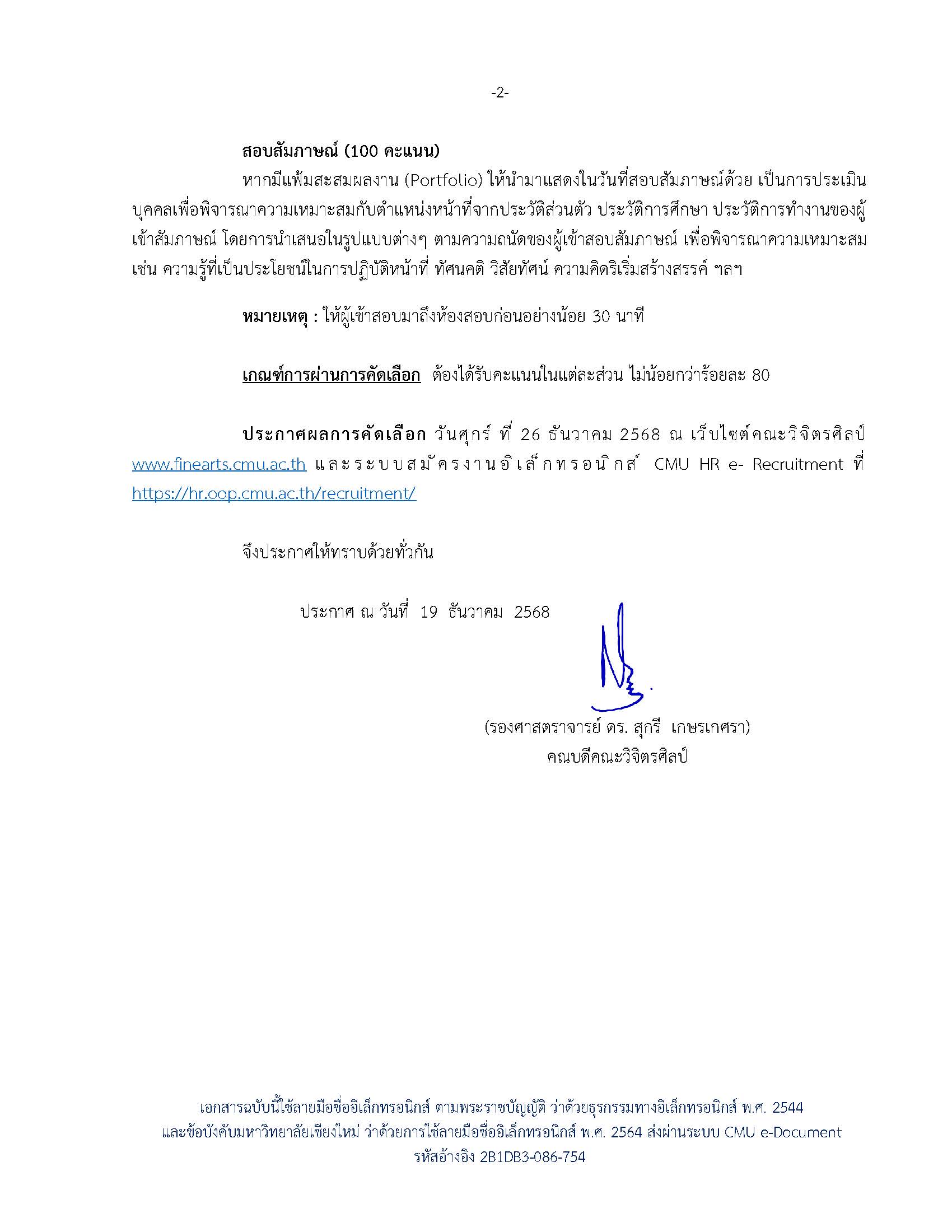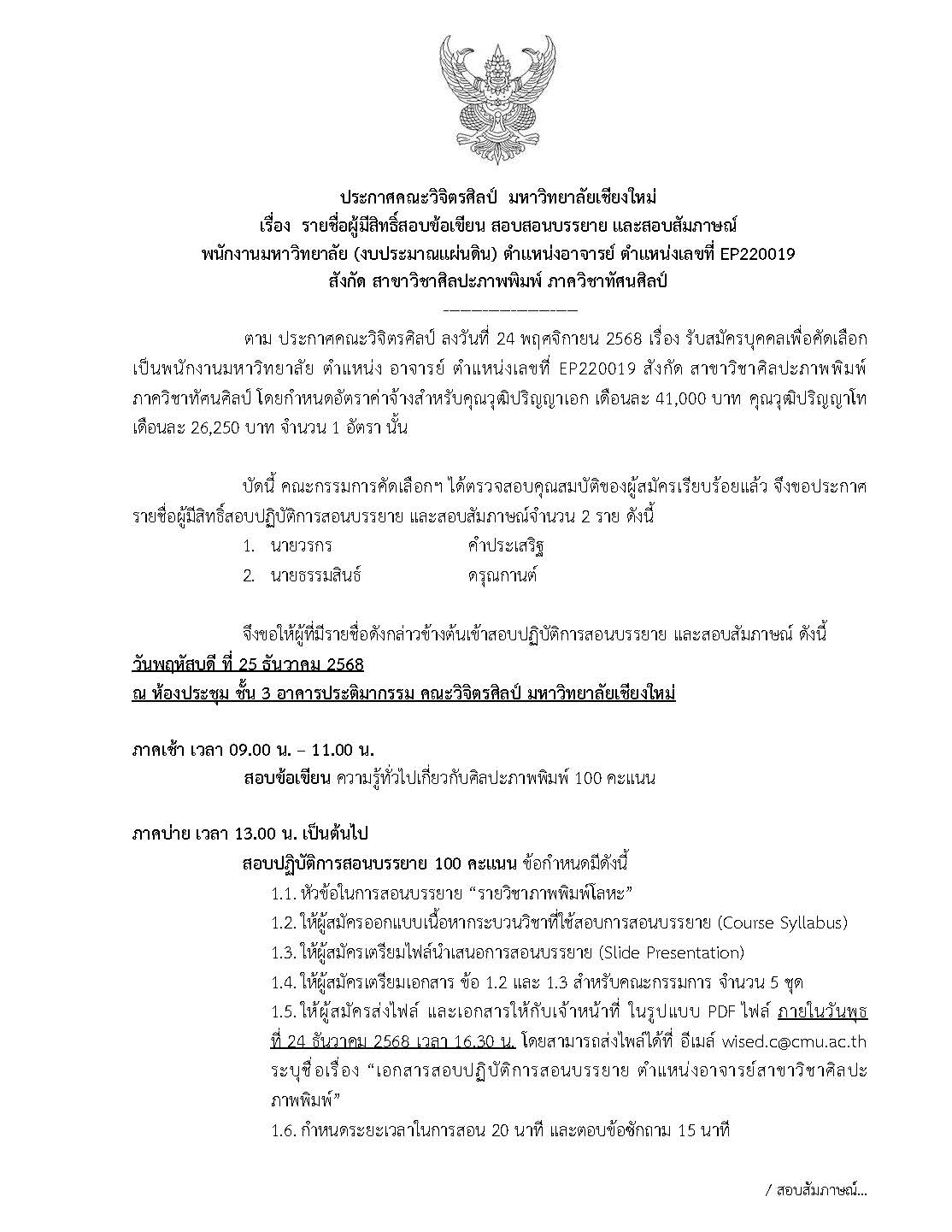ประกาศรายชื่อผู้มีสิทธิ์สอบข้อเขียน สอบสอนบรรยาย และสอบสัมภาษณ์ พนักงานมหาวิทยาลัย (งบประมาณแผ่นดิน) ตำแหน่งอาจารย์ ตำแหน่งเลขที่ EP220019 สังกัด สาขาวิชาศิลปะภาพพิมพ์ ภาควิชาทัศนศิลป์