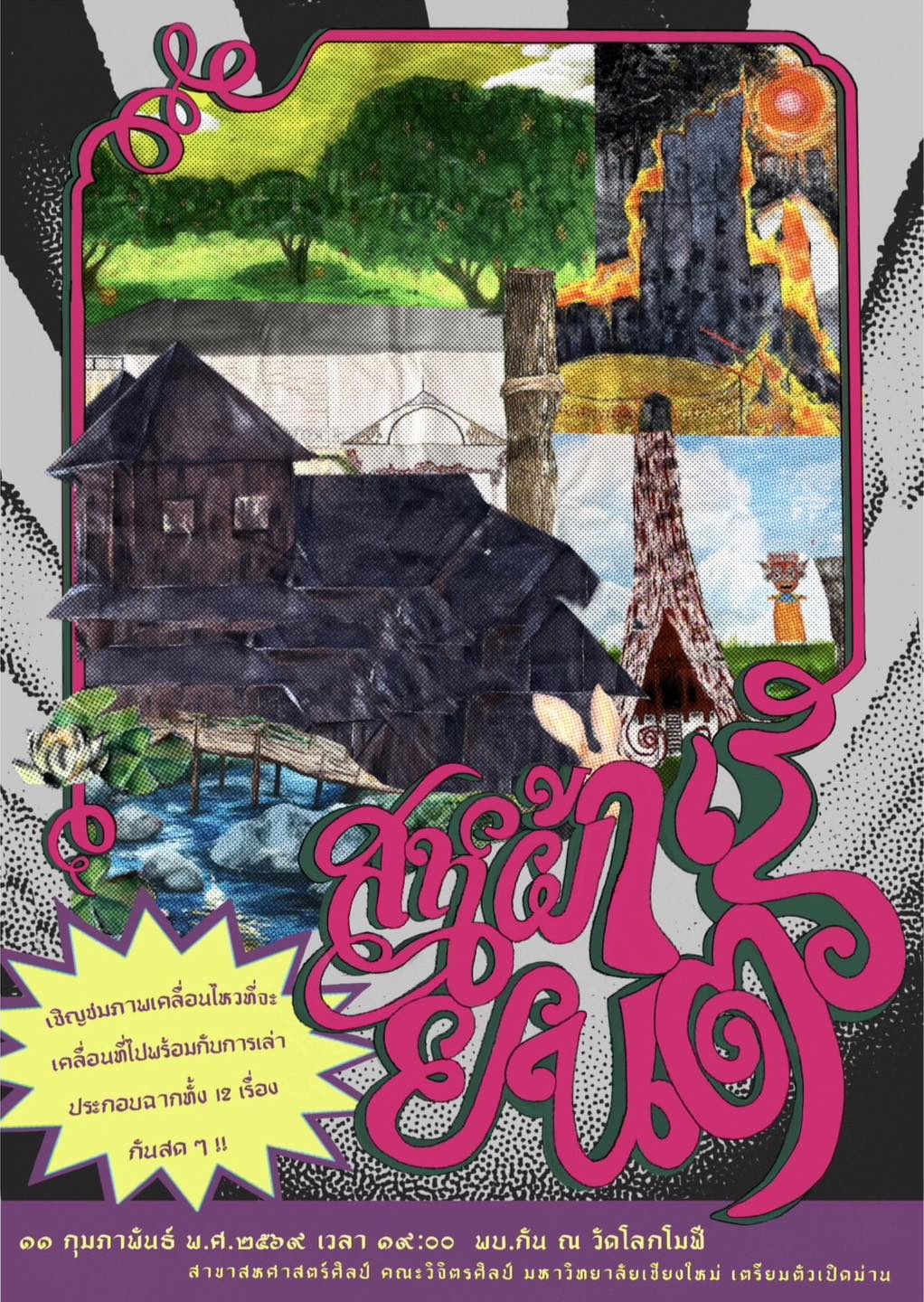 ‘สหผ้ายนตร์’ เป็นการสำรวจความสัมพันธ์ระหว่างเรื่องเล่าพื้นถิ่น ความเชื่อ ความทรงจำ และพื้นที่ ผ่านการซ้อนทับของภาษา ภาพฉาย และการแสดงสด เปิดพื้นที่ให้ผู้ชมได้ร่วมครุ่นคิด ตีความ และสัมผัสประสบการณ์ทางศิลปะในอีกมิติหนึ่ง