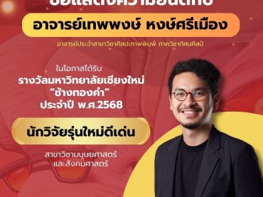 คณะวิจิตรศิลป์ มหาวิทยาลัยเชียงใหม่ ขอแสดงความยินดีอย่างยิ่งกับ อาจารย์เทพพงษ์ หงษ์ศรีเมือง ในโอกาสได้รับรางวัลมหาวิทยาลัยเชียงใหม่ “ช้างทองคำ” ประจำปี พ.ศ. 2568 | SDGS 4 11 17