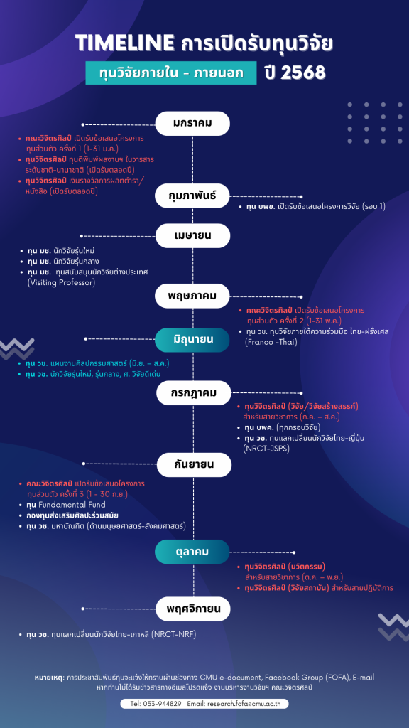 งานบริหารงานวิจัยฯ ได้สรุปช่วงเวลา (Timeline) การเปิดรับทุนวิจัย ทั้งจากแหล่งทุนภายใน-ภายนอก ปี พศ. 2568เพื่อให้คณาจารย์ทราบและเตรียมความพร้อมในการยื่นข้อเสนอโครงการทุนวิจัยในปีต่อๆ ไป